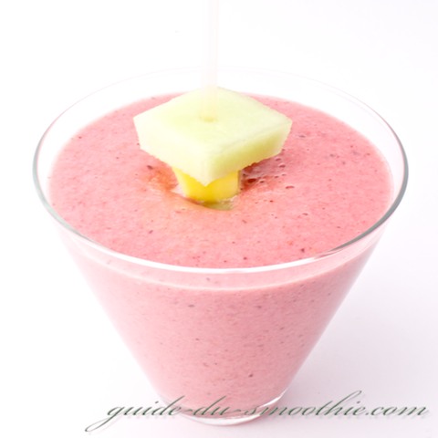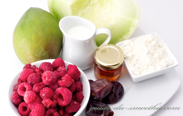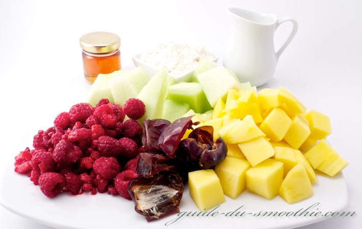Coupez le melon et mettez le en premier dans le blender puis ajoutez la mangue, les dattes et le lait écrémé.